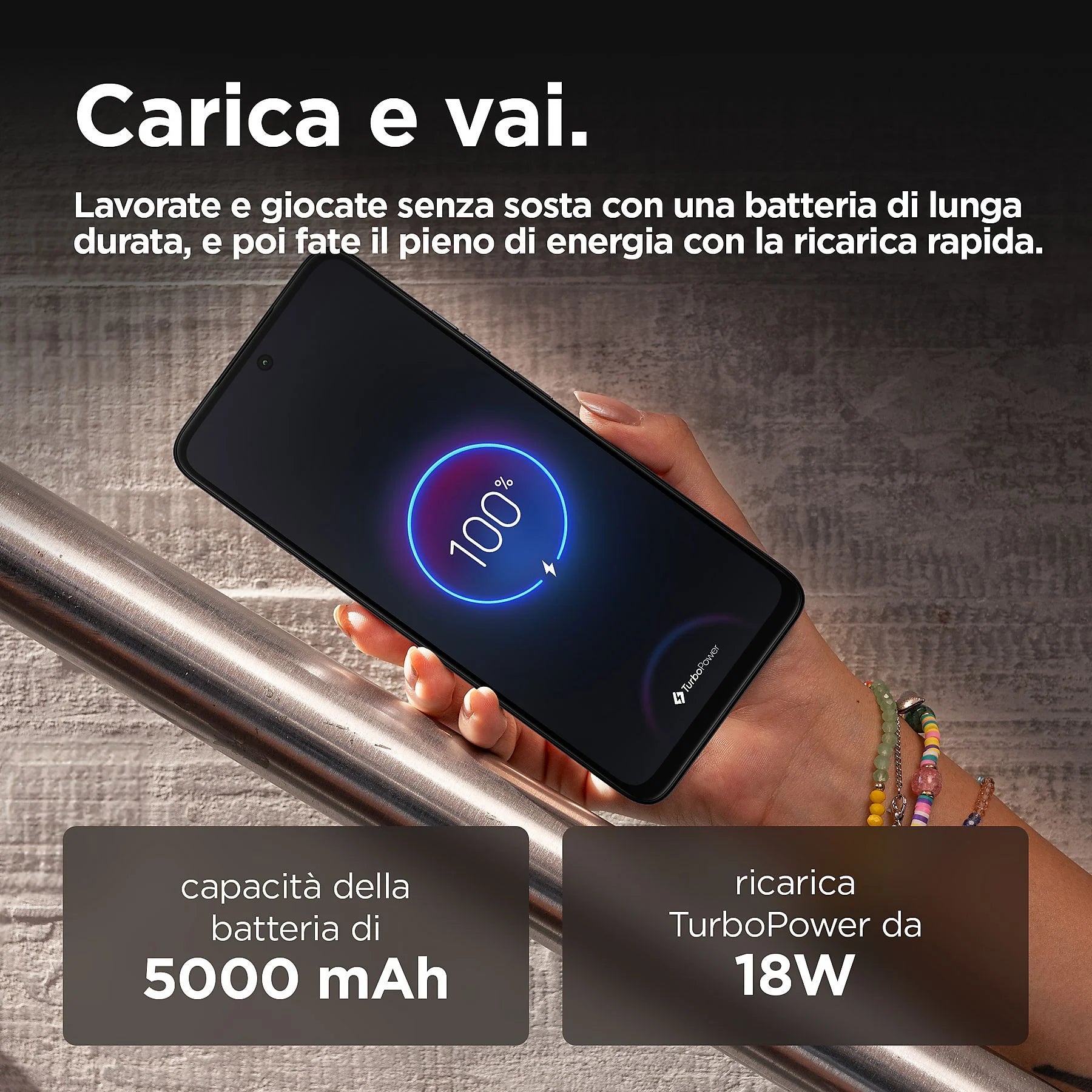Los momentos más importantes de la vida merecen un gran escenario. Descubre el moto g35 5G. Con una enorme pantalla FHD+ de 6,72’’, tus películas, juegos y videollamadas cobran vida incluso con mucha luz gracias a los 1000 nits de brillo máximo. Todo ello acompañado por un sonido Dolby Atmos® multidimensional en altavoces estéreo o en tus auriculares favoritos. Haz fotos espectaculares con el objetivo ultra gran angular o captura fotos vivas y definidas con cualquier luz gracias a la cámara de 50 MP con tecnología Quad Pixel. Disfruta del asombroso diseño ultrafino de primera calidad, que incluye la opción del exquisito tacto del cuero vegano. Disfruta de un rendimiento 5G ultrarrápido con el procesador de ocho núcleos, y consigue además 4 GB de RAM y hasta 256 GB de almacenamiento.(2,4) Además, disfrutarás de tus actividades sin preocupación gracias a la batería de larga duración. El moto g35 5G está diseñado para los grandes momentos.