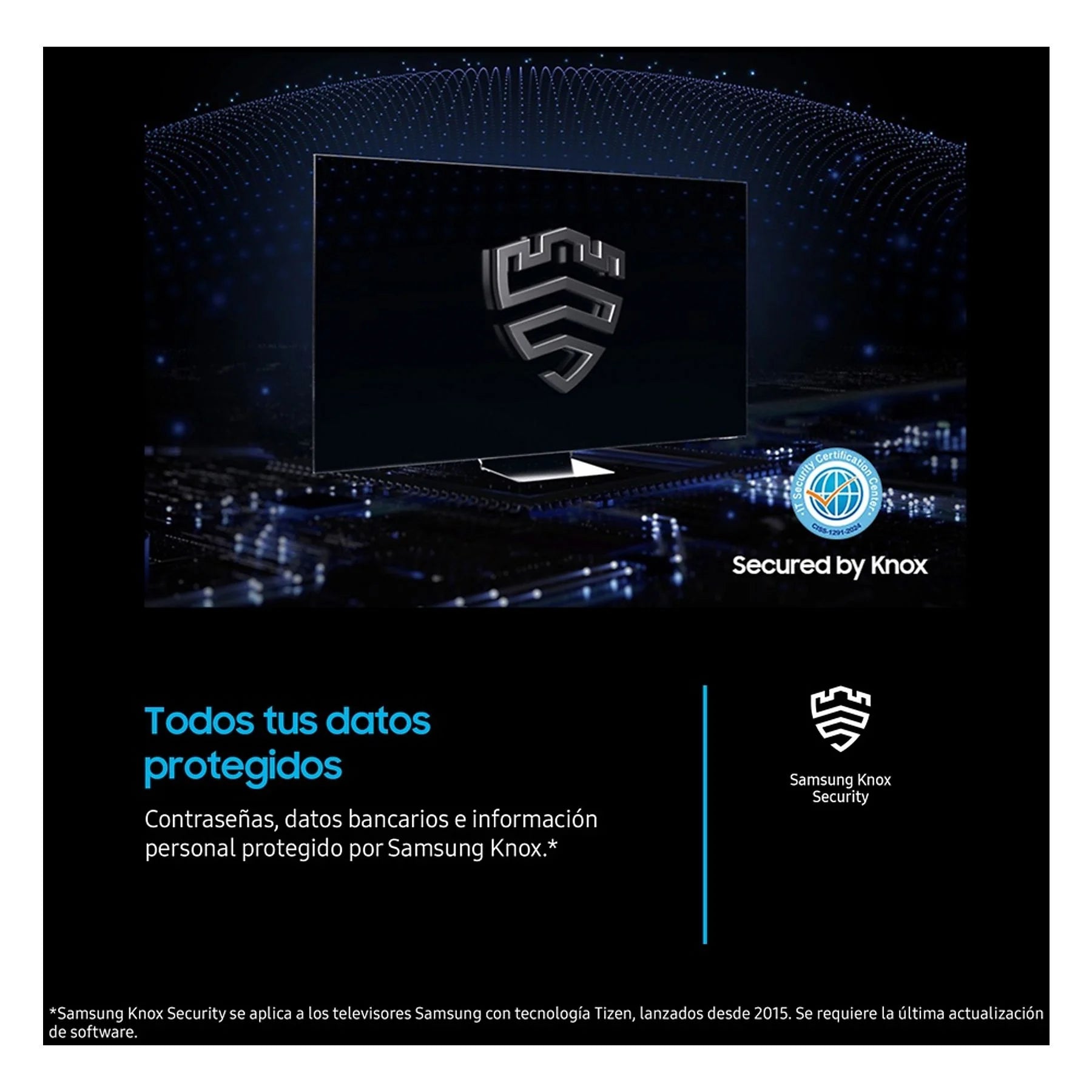 *Samsung Knox Security se aplica a los televisores Samsung con tecnología Tizen, lanzados desde 2025. Se requiere la última actualización de software. * La tecnología, las funciones y las características disponibles pueden variar según el país, el proveedor de servicios, el entorno de red o el producto, y están sujetas a cambios sin previo aviso. * Requiere una conexión Wi-Fi, Bluetooth u otra red inalámbrica e iniciar sesión en la cuenta de Samsung. * Los dispositivos conectados se venden por separado. * El uso de la tecnología tranquila requiere la aceptación de los avisos de privacidad tanto de SmartThings como del dispositivo registrado automáticamente. * El televisor y el dispositivo móvil deben estar conectados a SmartThings para usar la función de vista de mapa 3D. Para obtener una lista detallada de los dispositivos compatibles, visite https://partners.smartthings.com/supported-devices. * La interfaz de usuario está sujeta a cambios sin previo aviso. La tasa de ahorro de energía puede variar según las regiones, los modelos, los tamaños, las condiciones de visualización o los tipos de contenido. Los productos enviados en modo Eco tienen algunas funciones del modo AI Energy habilitadas de manera predeterminada, por lo que el nivel de ahorro de energía al activar el modo AI Energy puede parecer inferior al real. El modo AI Energy no funciona con el modo Juego. El ahorro de energía se basa en los resultados de pruebas internas y puede variar según el contenido que se muestra y los niveles de brillo ambiental.